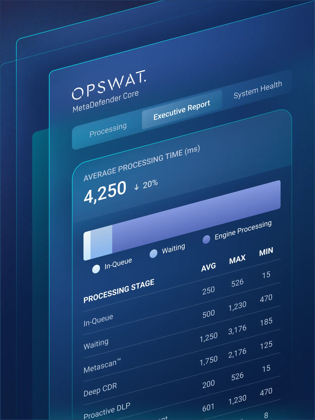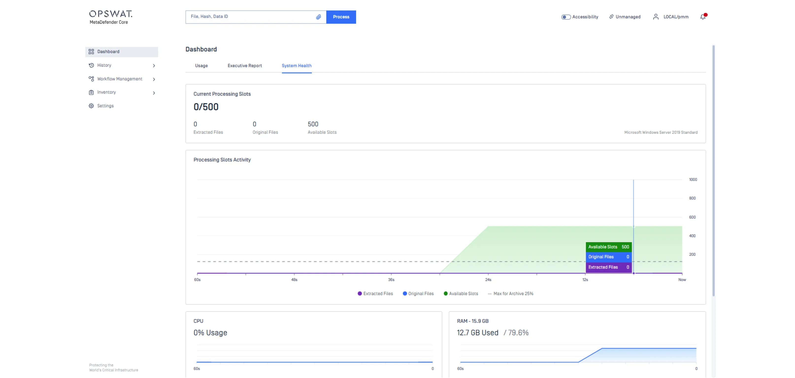 View a unified dashboard that summarizes processed files and threat activity. Access executive reports with detailed scan results. Monitor system availability and key resource metrics such as CPU, RAM, and engine status to maintain reliable performance.